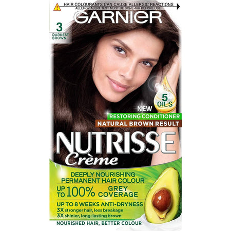 - Contents: 1x Garnier Nutrisse Permanent Hair Dye, Natural-looking, hair colour result, For All Hair Types, Shade: 3 Darkest Brown