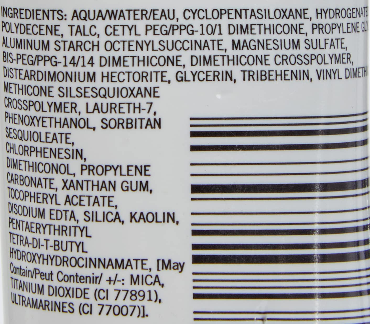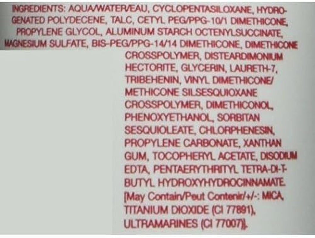 Aqua/water/eau, Cyclopentasiloxane, Hydrogenated Polydecene, Talc, Cetyl Peg/ppg-10/1 Dimethicone, Propylene Glycol, Aluminum Starch Octenylsuccinate, Magnesium Sulfate, Bis-peg/ppg-14/14 Dimethicone, Dimethicone Crosspolymer, Disteardimonium Hectorite, Glycerin, Laureth-7, Tribehenin, Vinyl Dimethicone/methicone Silsesquioxane Crosspolymer, Dimethiconol, Phenoxyethanol, Sorbitan Sesquioleate, Chlorphenesin, Propylene Carbonate, Xanthan Gum, Tocopheryl Acetate, Disodium Edta, Pentaerythrityl Tetra-di-t-butyl Hydroxyhydrocinnamate, [May Contain +/-: Mica, Titanium Dioxide (Ci 77891), Ultramarines (Ci 77007)]