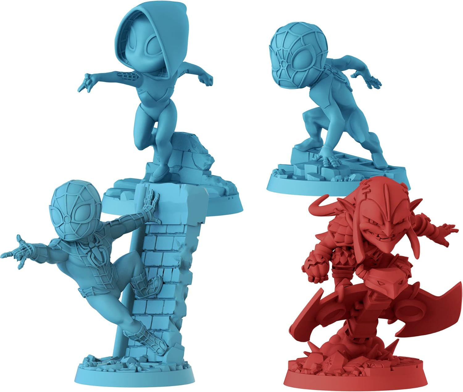 - ENTER THE SPIDER-VERSE: This expansion for Marvel United introduces Peter Parker’s Spider-Man, Miles Morales, and Gwen Stacy’s Ghost-Spider. They’ll be facing off against the evil Green Goblin, Norman Osborne, as he flies around on his goblin glider. All three heroes and the Green Goblin are represented on the table as highly-detailed sculpts.