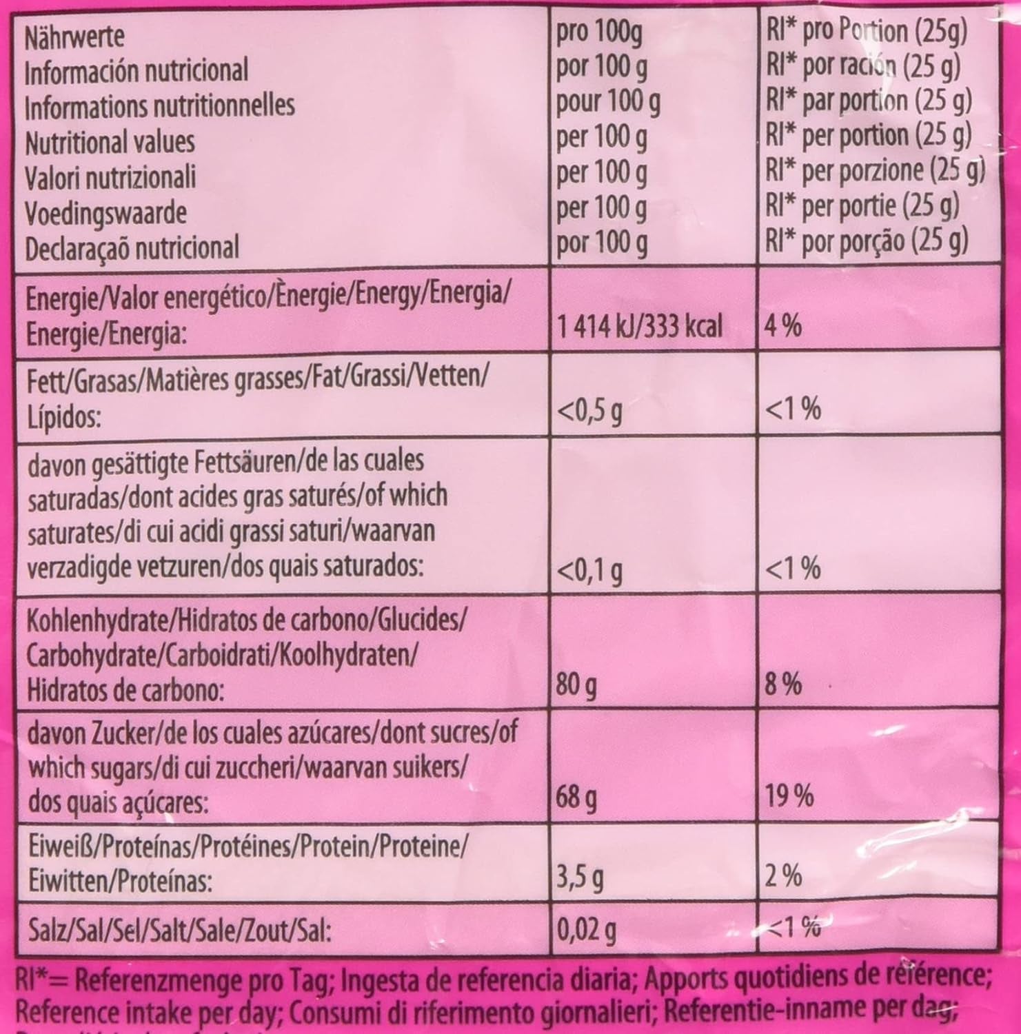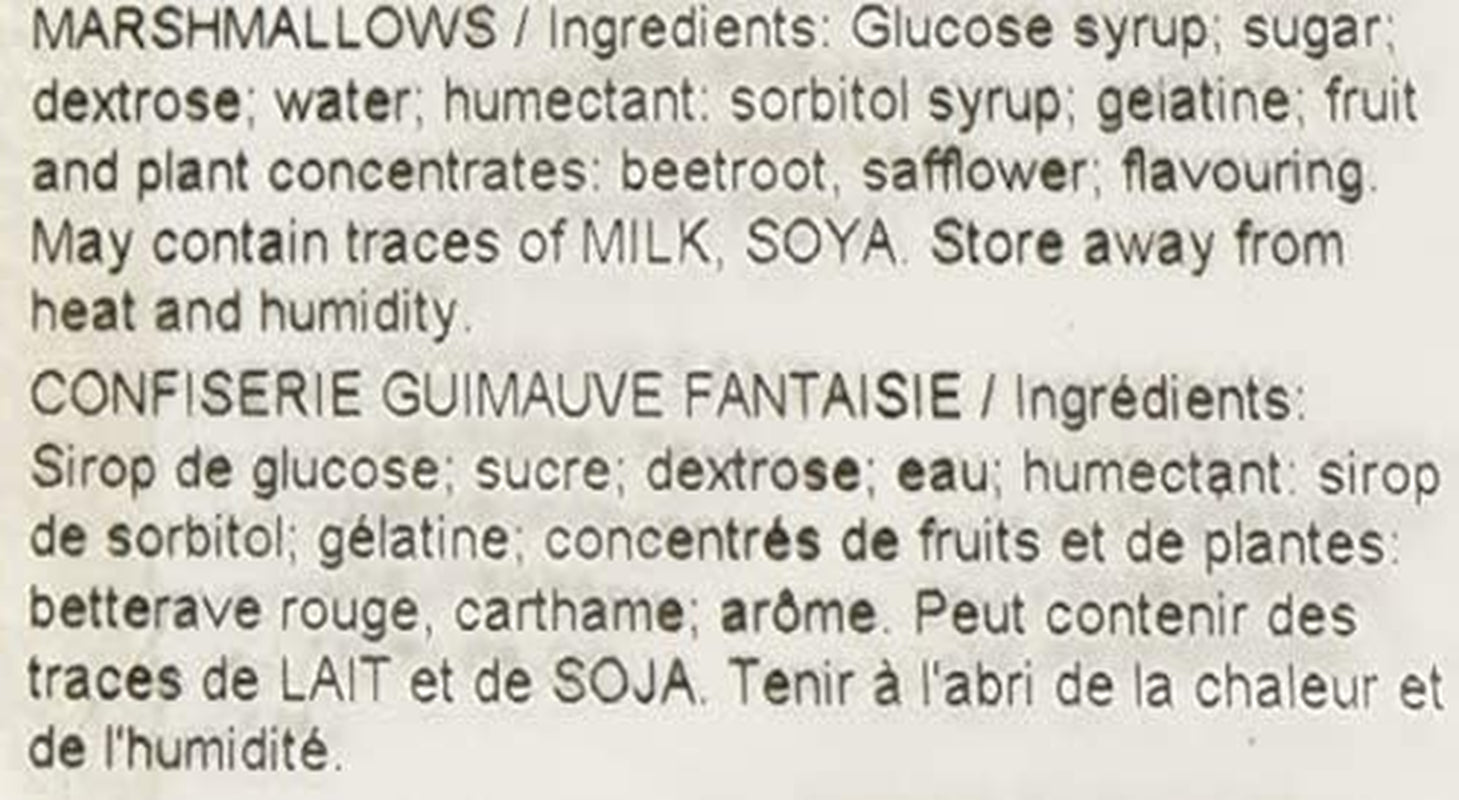 Glucose syrup; Sugar; dextrose; water; humectant: sorbitol syrup; gelatine; fruit and plant concentrates: beetroot; safflower; flavouring. May contain traces of MILK, SOYA