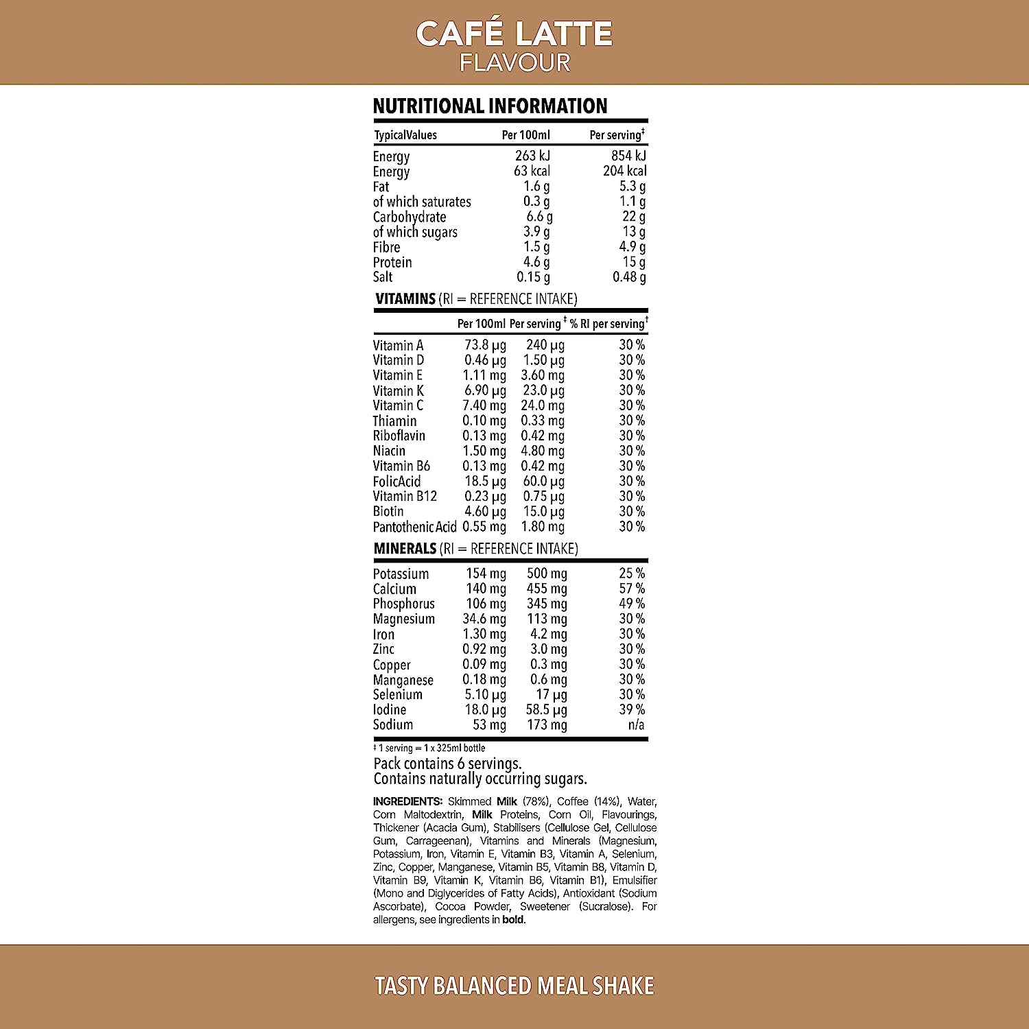 Ready to Drink Shake, Tasty, Balanced Shake with 15G Protein, 23 Vitamins and Minerals and No Sugar, Cafe Latte Flavour, 6 X 325 Ml Multipack, Packaging May Vary