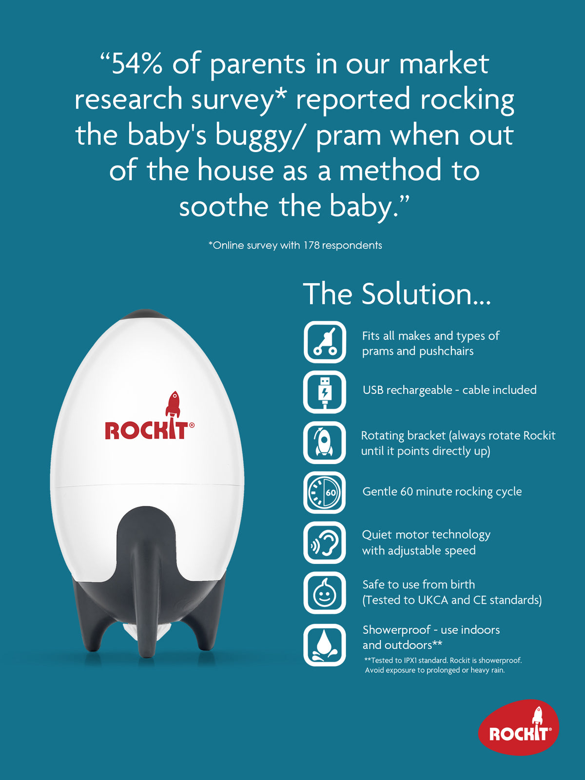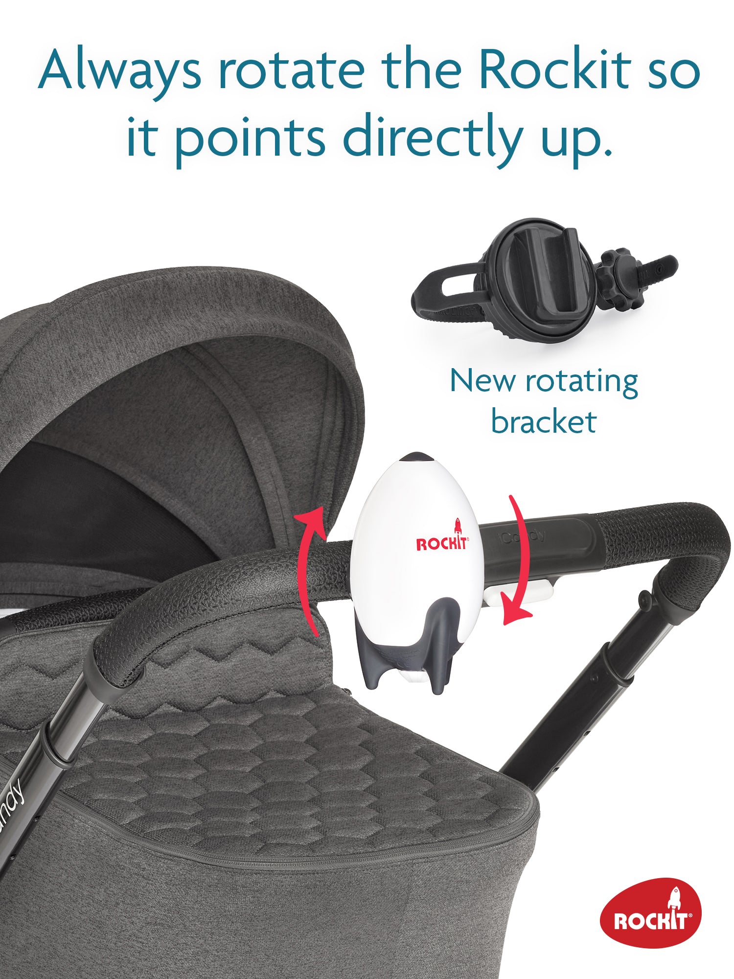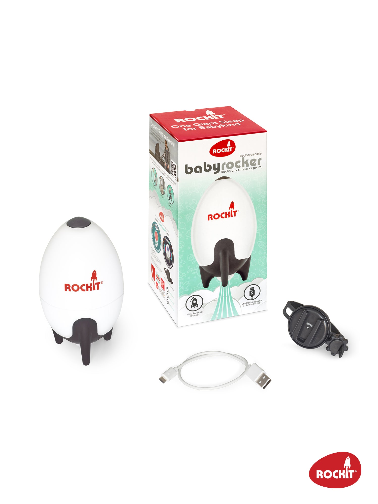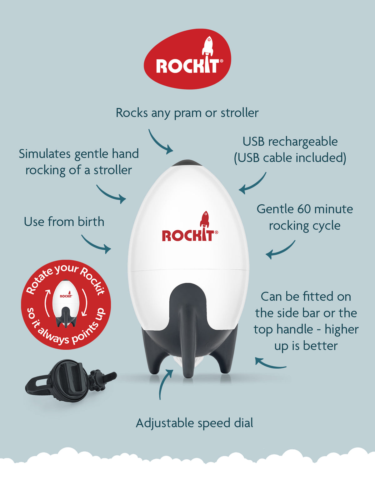 • Rotates so the Rockit can always be vertical making it more efficient and allowing a slower rocking speed and better battery life