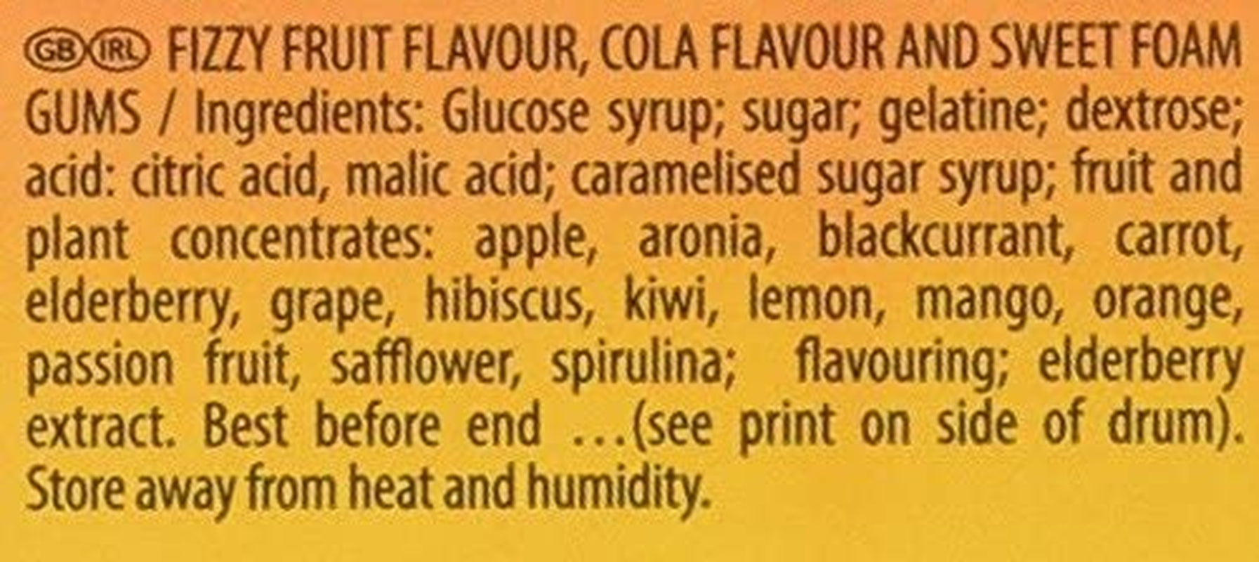 Glucose Syrup, Sugar, Gelatine, Dextrose, Acid: Citric Acid, Malic Acid, Caramelised Sugar Syrup, Fruit and Plant Concentrates: Apple, Aronia, Blackcurrant, Carrot, Elderberry, Grape, Hibiscus, Kiwi, Lemon, Mango, Orange, Passion Fruit, Safflower, Spirulina, Flavouring, Elderberry Extract