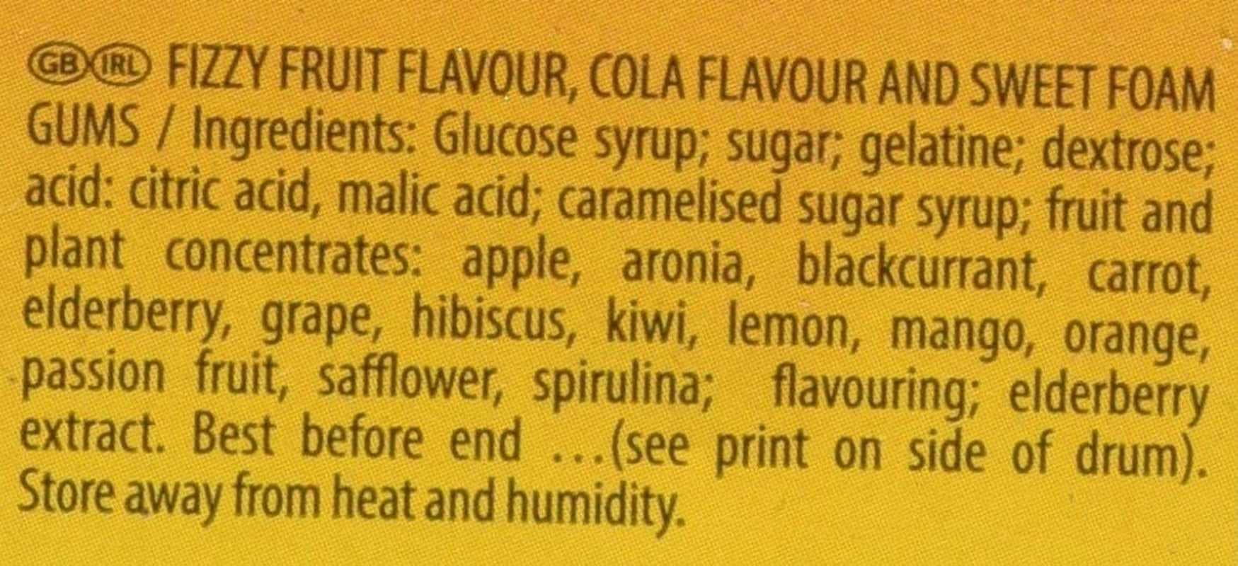 Glucose Syrup, Sugar, Gelatine, Dextrose, Acid: Citric Acid, Malic Acid, Caramelised Sugar Syrup, Fruit and Plant Concentrates: Apple, Aronia, Blackcurrant, Carrot, Elderberry, Grape, Hibiscus, Kiwi, Lemon, Mango, Orange, Passion Fruit, Safflower, Spirulina, Flavouring, Elderberry Extract